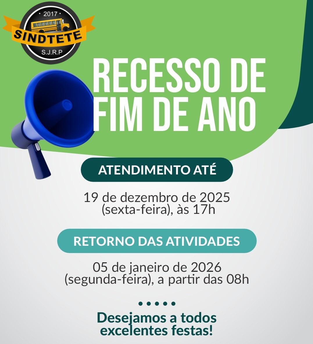 COMUNICADO RECESSO ESCOLAR Post publicado:19/12/2025 Categoria do post:Notícias e Artigos Você também pode gostar PARABENS A TODOS OS MOTORISTAS PELO SEU DIA 25/07/2023 COMUNICADO DE RECISÃO MEGAVALE 02/10/2024 EDITAL DE CONVOCAÇÃO ASSEMBLEIA EXTRAORDINARIA EMPREGADOS EMPRESA STAFFS 05/12/2022